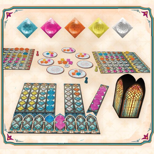 Players can expect to discover new unique art and components in Azul: Stained Glass of Sintra, including translucent window pane pieces, a tower to hold discarded glass panes, and double-sided player boards and window pane panels, in addition to many other beautiful components!