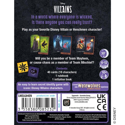 Imagine a dark and desolate realm, filled only with chaos and misfortune, where only the truly evil and most powerful villains can survive and thrive. In a world where everyone is wicked, is there anyone you can really trust? In Gathering of the Wicked, based on Werewolves of Miller's Hollow, you play as a Disney villain such as Maleficent, Hades, or Captain Hook who is gathering in a dark realm with various henchmen. There, two teams fight for control, alternating between day and night phases. Each night, the villains wake up one by one and use their unique abilities to chase their objectives. Each day, the gathering debates and tries to unmask the traitors amongst them, but since no one knows which team other players are on, trusting each other will be tricky, and bluffing will be their best route to dominance within their new surroundings. While each role is known by the other players, every character also has a "secret alignment" that determines their objective — making it even trickier to know who to trust!