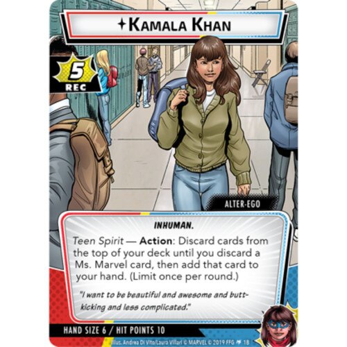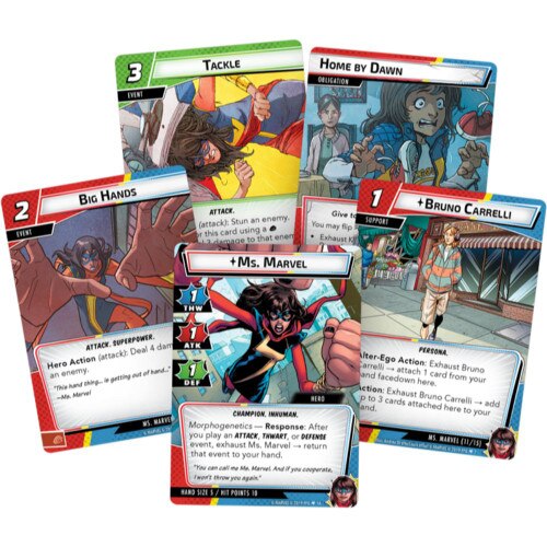 Already struggling with who she was, and who she wanted to be, teenager Kamala Khan just wanted a simple life. But when Kamala was trapped in a Terrigen Mist enveloping New Jersey, her life got a lot more complex! After emerging from the mist, Kamala discovered she was able to morph her body into nearly anything! Inspired by her idol Carol Danvers, Kamala took on the name Ms. Marvel and New Jersey gained its very own teenage crime fighter! Fantasy Flight Games is proud to announce the Ms. Marvel Hero Pack for Marvel Champions: The Card Game! Ms. Marvel is one of the most flexible heroes in the game, able to fit into whatever role is needed while learning to be a hero and protecting her friends from harm!