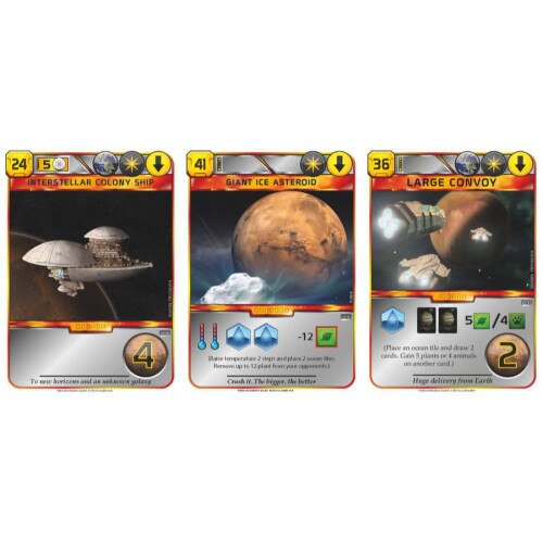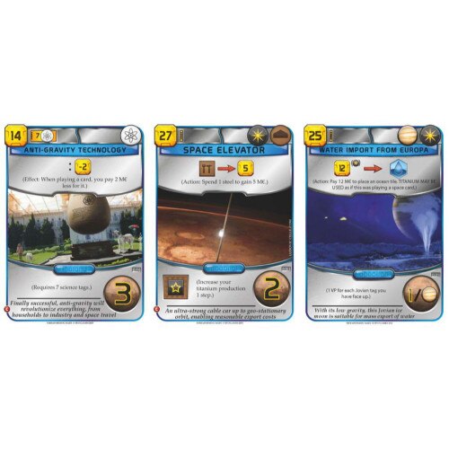 The players acquire unique project cards (from over two hundred different ones) by buying them to their hand. The projects (cards) can represent anything from introducing plant life or animals, hurling asteroids at the surface, building cities, to mining the moons of Jupiter and establishing greenhouse gas industries to heat up the atmosphere. You compete for the best places for your city tiles, ocean tiles and greenery tiles. When the Terraforming is complete, the player Corporation with the most victory points wins.